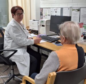 Kuvassa geriatri Sari Mäkelä vastaanottotyössään